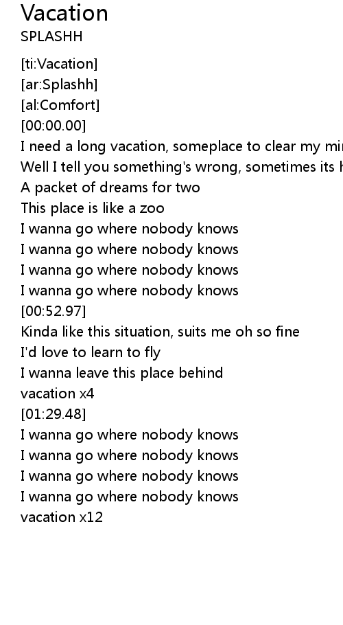 | [00:14.04] | I need a long vacation, someplace to clear my mind |