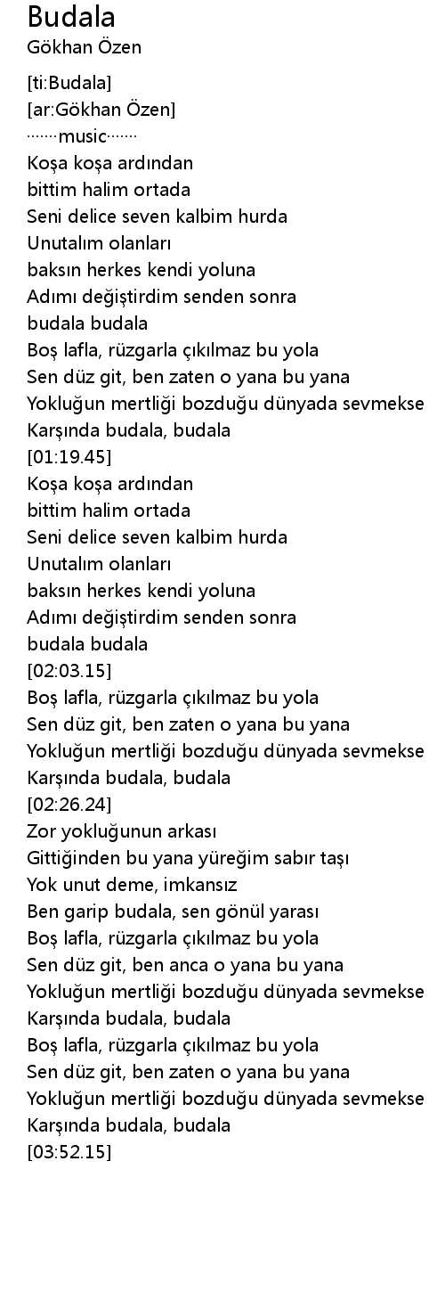 | [00:58.14] | Bo lafla, rü zgarla k lmaz bu yola |