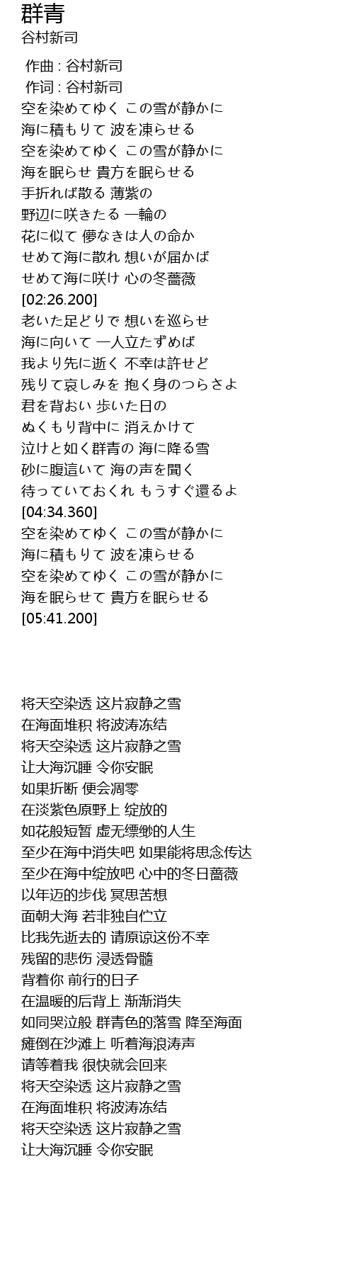 | [03:56.930] | 泣けと如く群青の 海に降る雪 |