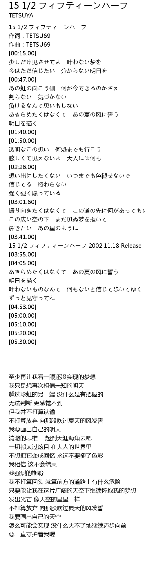 | [00:00.00] | 15 1/2 フィフティーンハーフ |