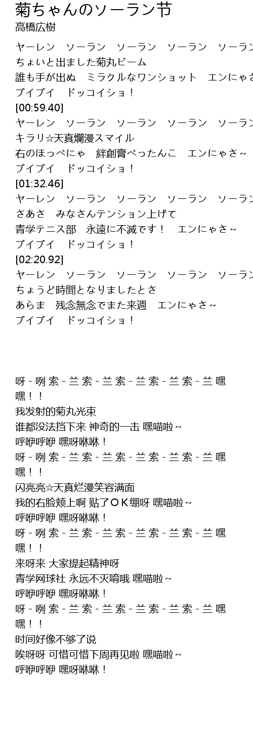 | [02:00.25] | 呀-咧 索-兰 索-兰 索-兰 索-兰 索-兰 嘿 嘿!! |