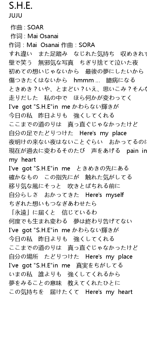 | [00:58.95] | I've got "S.H.E"in me かわらない輝きが |