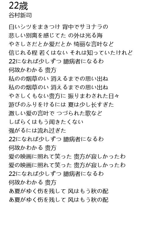 | [01:09.980] | 22になれば少しずつ 臆病者になるわ |