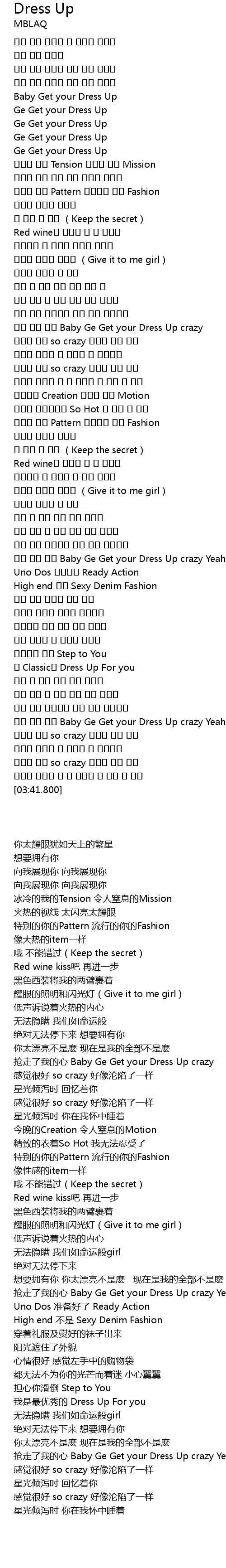 | [03:18.450] | Baby Ge Get your Dress Up crazy Yeah |