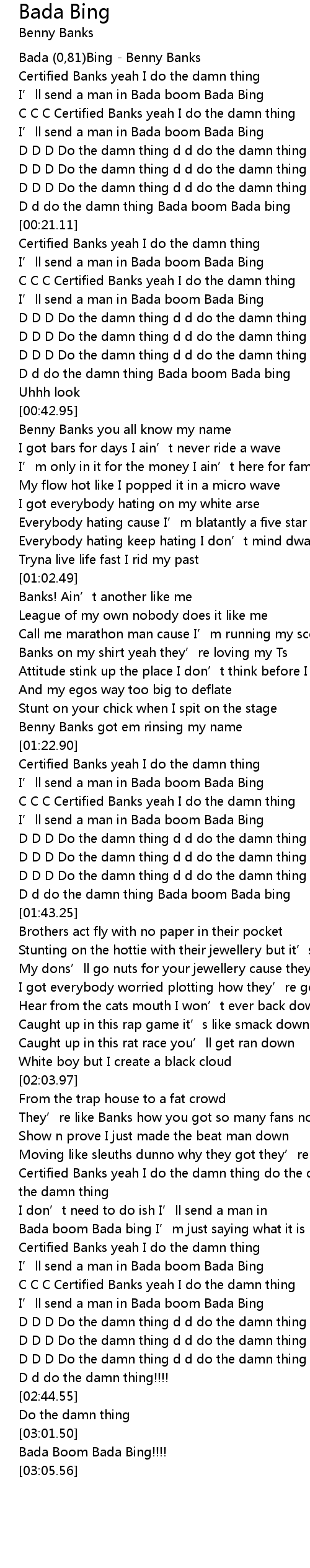 | [00:38.96] | D d do the damn thing Bada boom Bada bing |