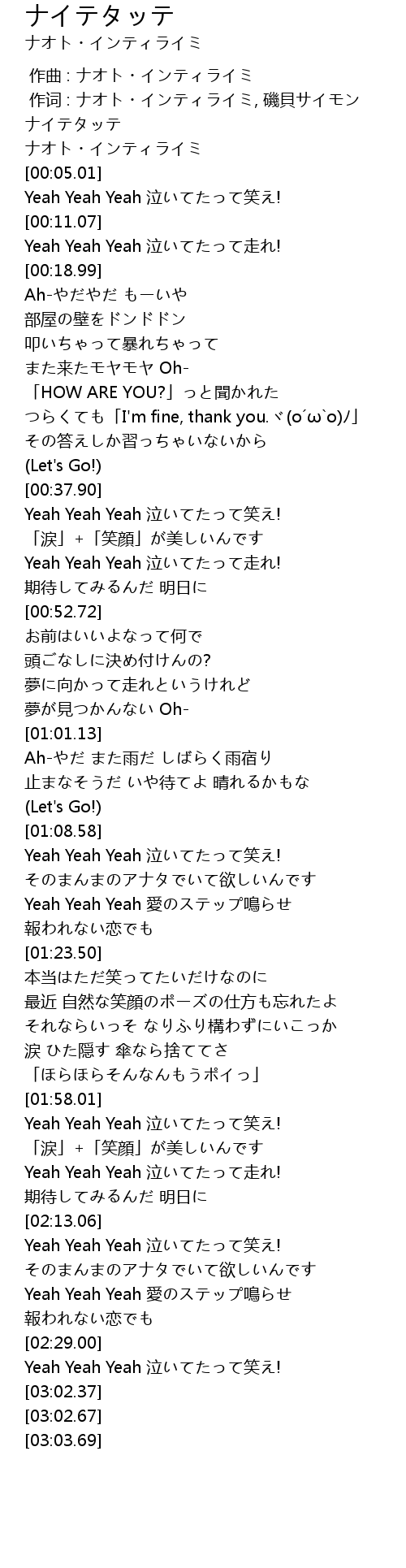 | [00:01.03] | ナオト・インティライミ |