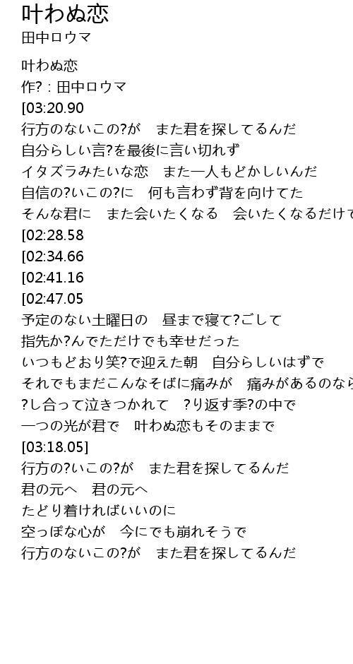 | [03:26.98] | 行方の?いこの?が また君を探してるんだ |