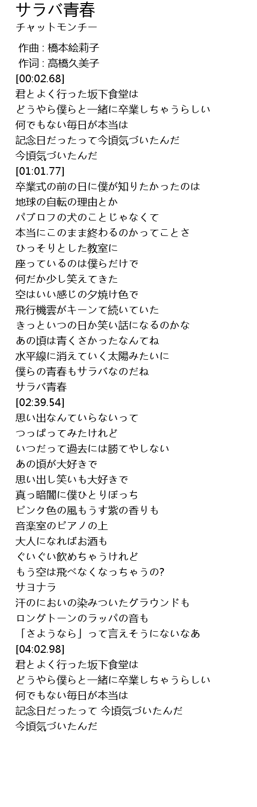 | [02:30.31] | サラバ青春 |