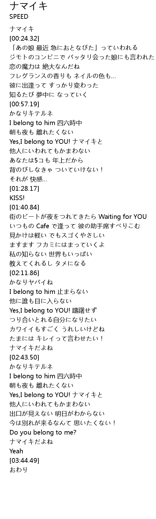 | [03:15.29] | Yes,I belong to YOU! ナマイキと |