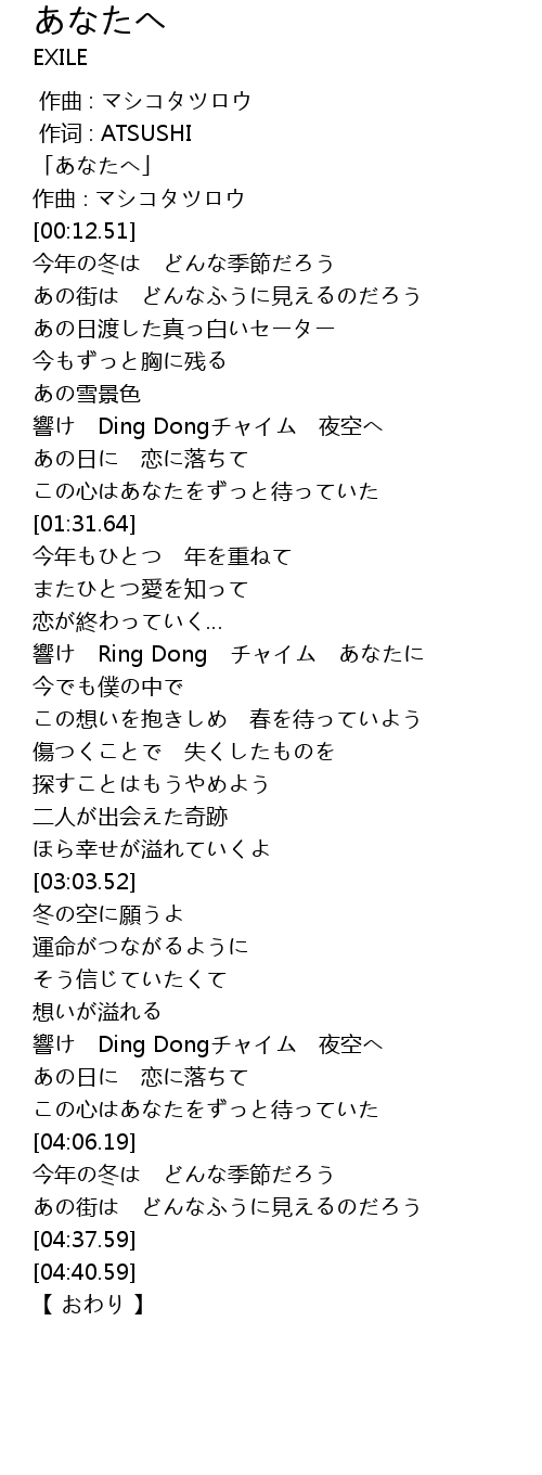 | [00:01.51] | 「あなたへ」 |