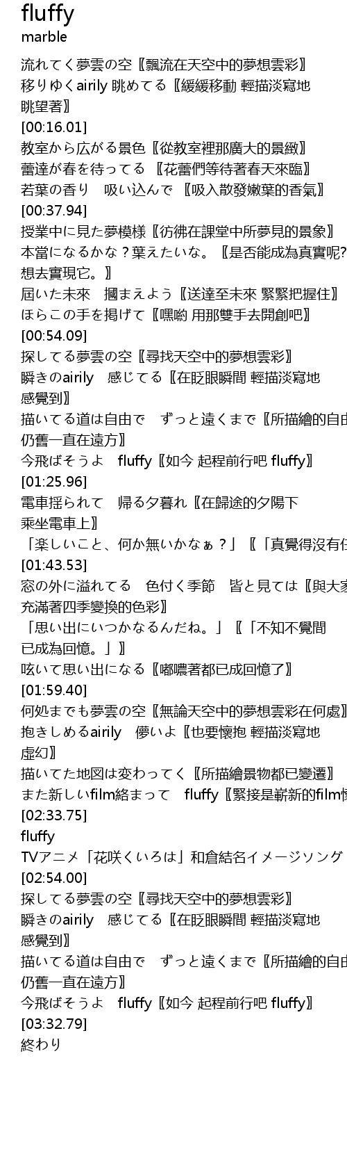 | [02:18.04] | また新しいfilm絡まって fluffy〖緊接是嶄新的film懷抱我們是fluffy〗 |