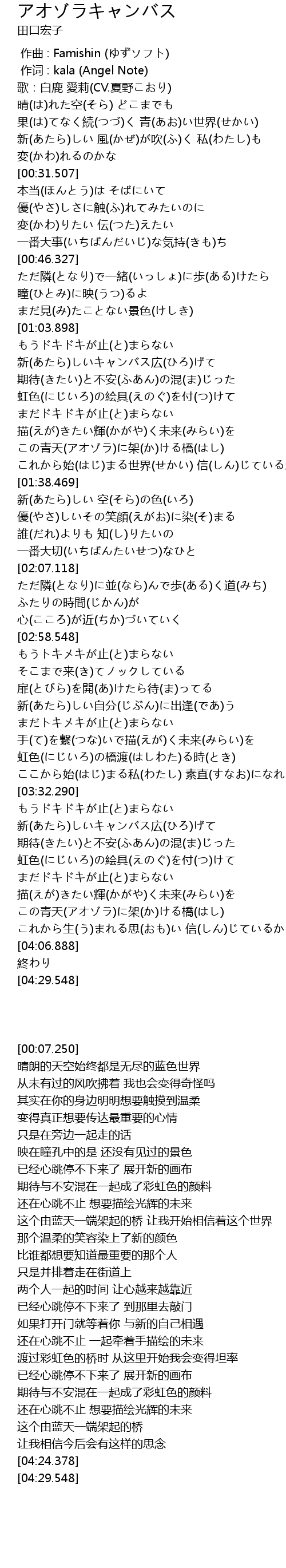 | [03:55.868] | この青天(アオゾラ)に架(か)ける橋(はし) これから生(う)まれる思(おも)い 信(しん)じているから |