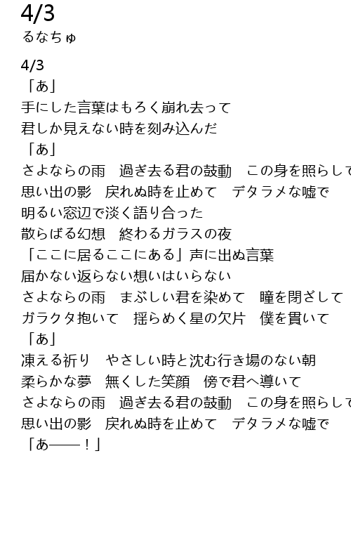 | [01:09.05] | さよならの雨 過ぎ去る君の鼓動 この身を照らして |