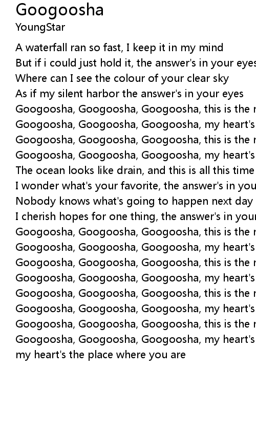 [01:28.411] Googoosha, Googoosha, Googoosha, my heart's the place where you are