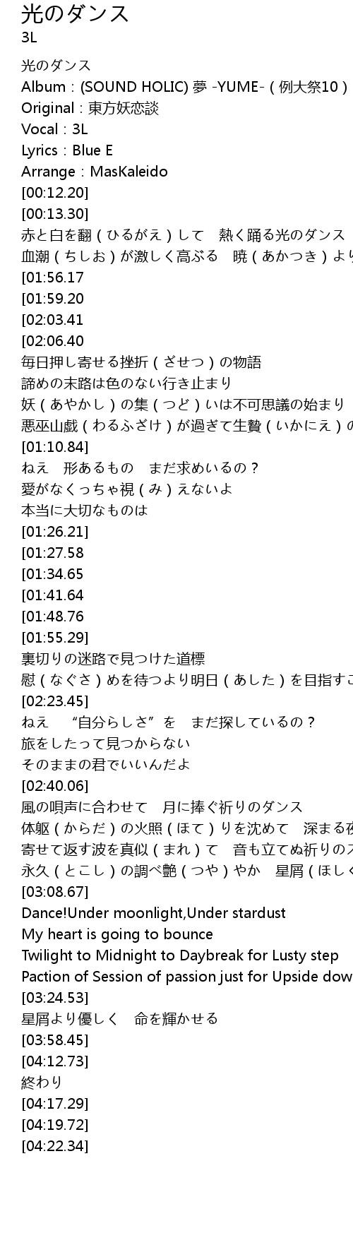| [04:06.22][02:03.41][00:36.36] | I’m dancing,endless dancing |
