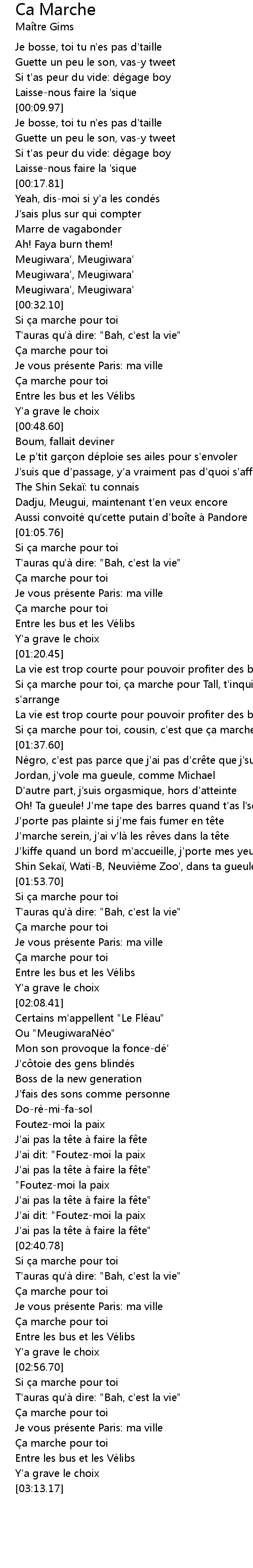| [00:56.13] | J'suis que d'passage, y'a vraiment pas d'quoi s'affoler |