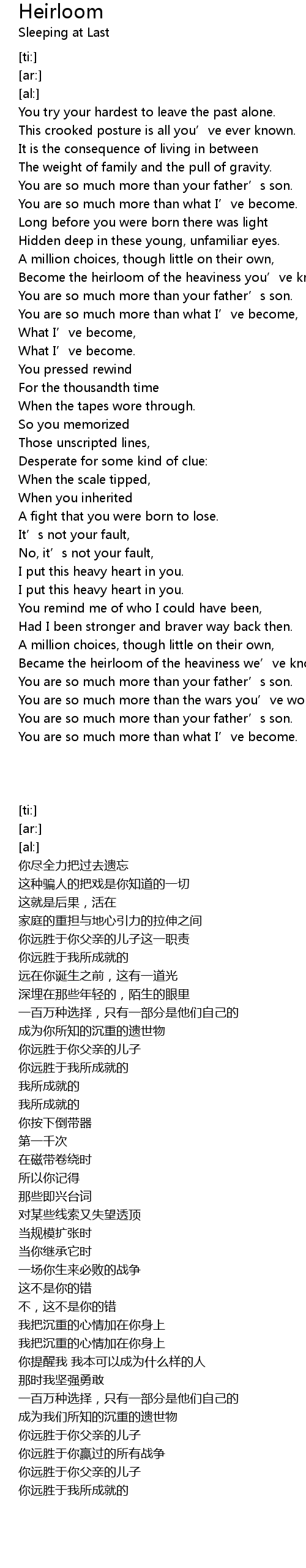 | [02:43.87] | Became the heirloom of the heaviness we' ve known. |