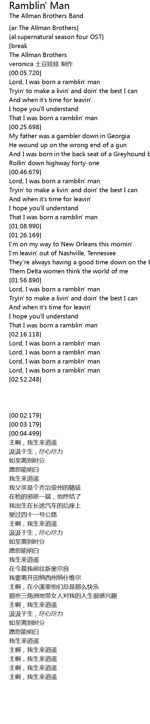 | [00:49.169] | Lord, I was born a ramblin' man |