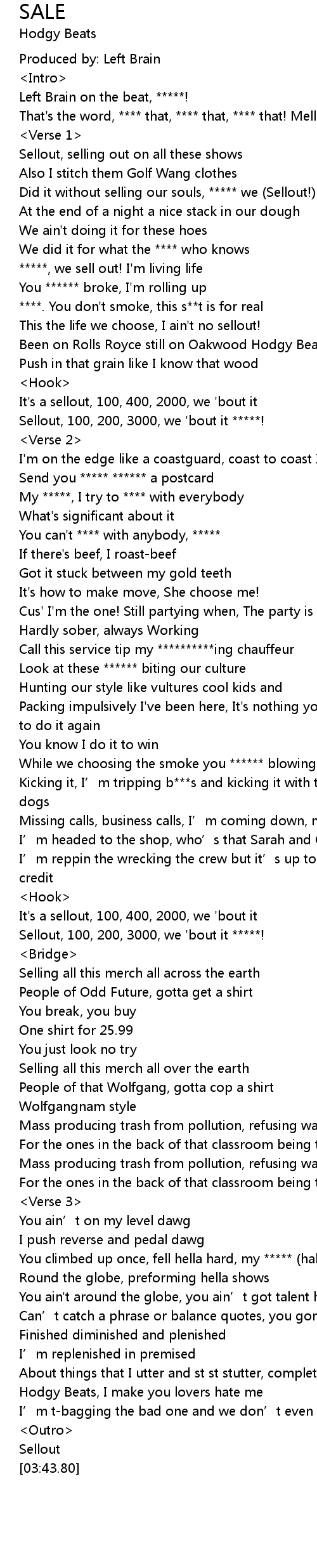| [00:18.50] | Did it without selling our souls, ***** we (Sellout!) |