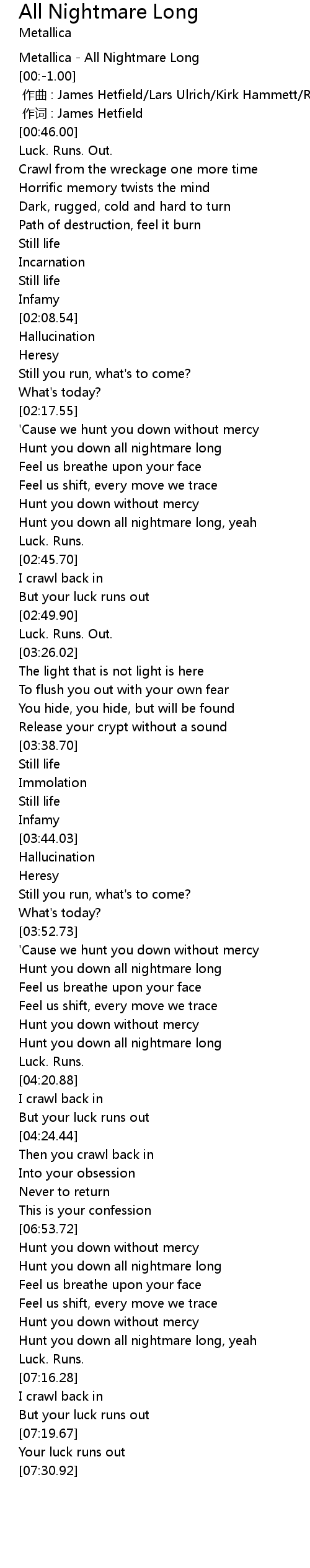 | [00:00.00] | 作曲 : James Hetfield/Lars Ulrich/Kirk Hammett/Robert Trujillo |