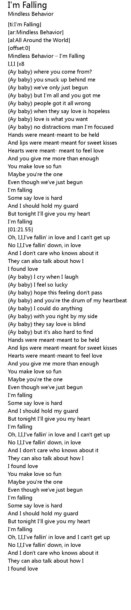 | [00:00.16] | Mindless Behavior – I'm Falling |