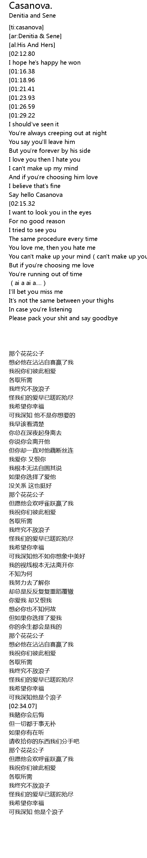 | [00:10.22][02:12.80][03:14.20] | Say hello Casanova |