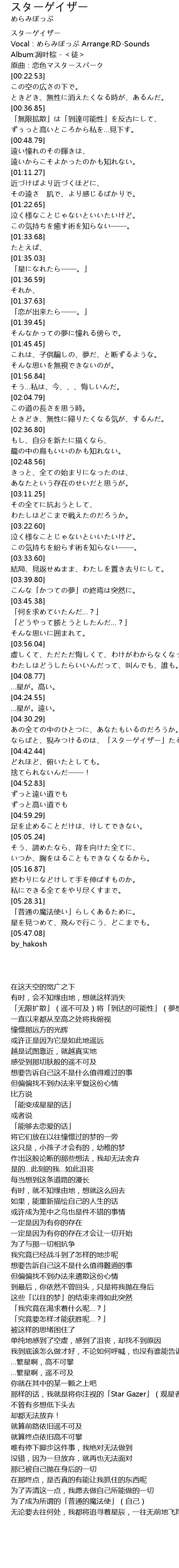 | [04:36.68] | ならばと、猊みつけるのは、「スターゲイザー」たるわたし。 |