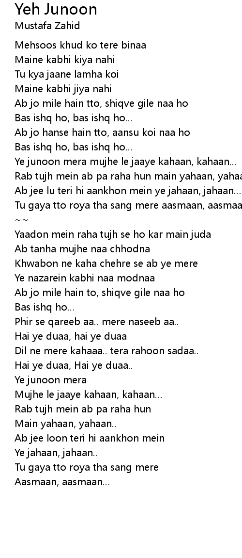 | [01:43.433] | Ye junoon mera mujhe le jaaye kahaan, kahaan… |
