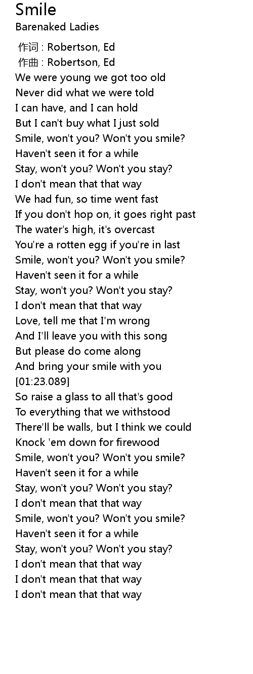 | [02:04.611] | Smile, won't you? Won't you smile? |