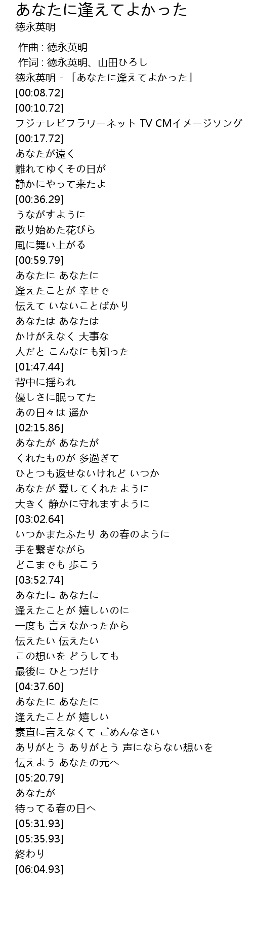 | [00:06.72] | 徳永英明 - 「あなたに逢えてよかった」 |