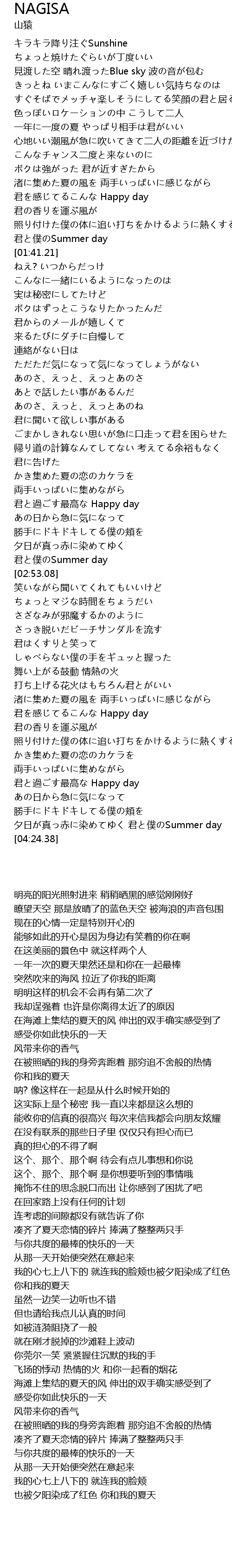 | [00:31.66] | キラキラ降り注ぐSunshine ちょっと焼けたぐらいが丁度いい |