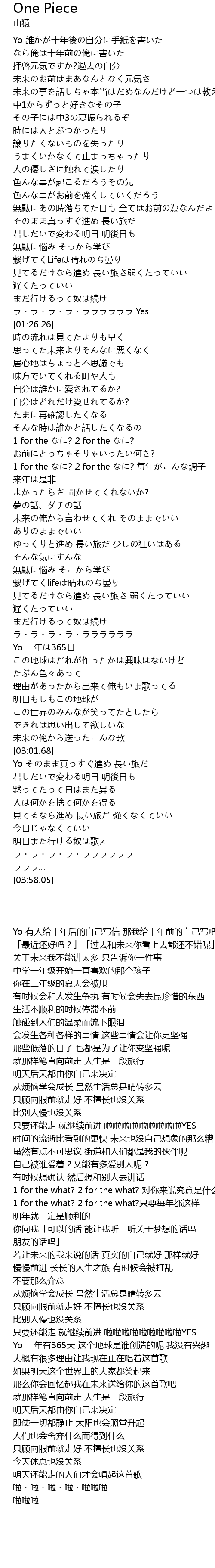 | [03:20.15] | 明日また行ける奴は歌え ラ・ラ・ラ・ラ・ララララララ |