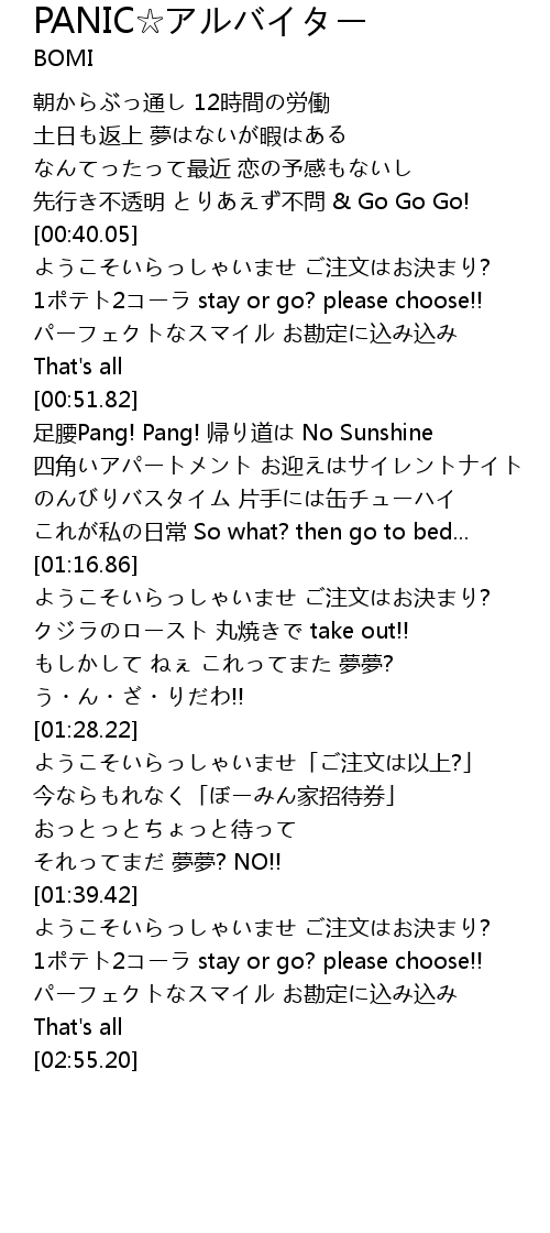 | [02:46.43] | 1ポテト2コーラ stay or go? please choose!! |