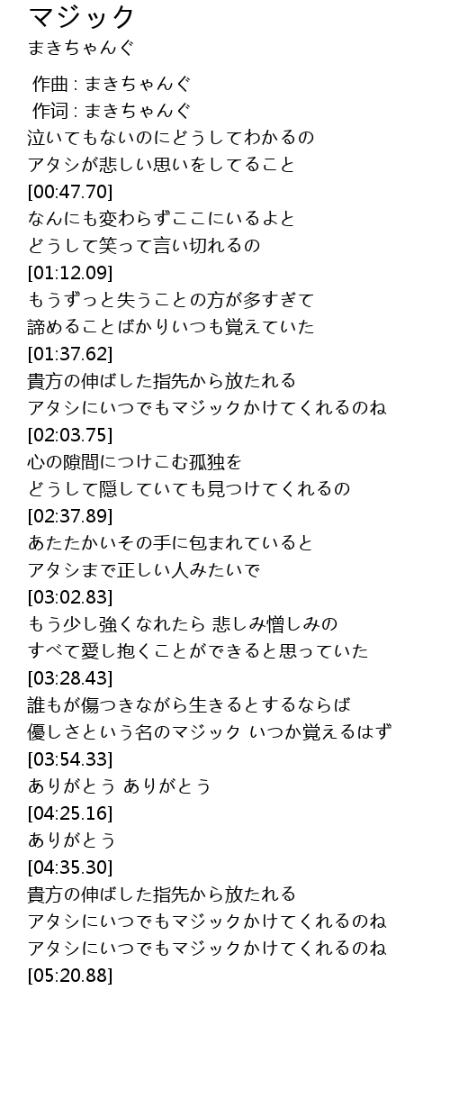 | [03:41.13] | 優しさという名のマジック いつか覚えるはず |