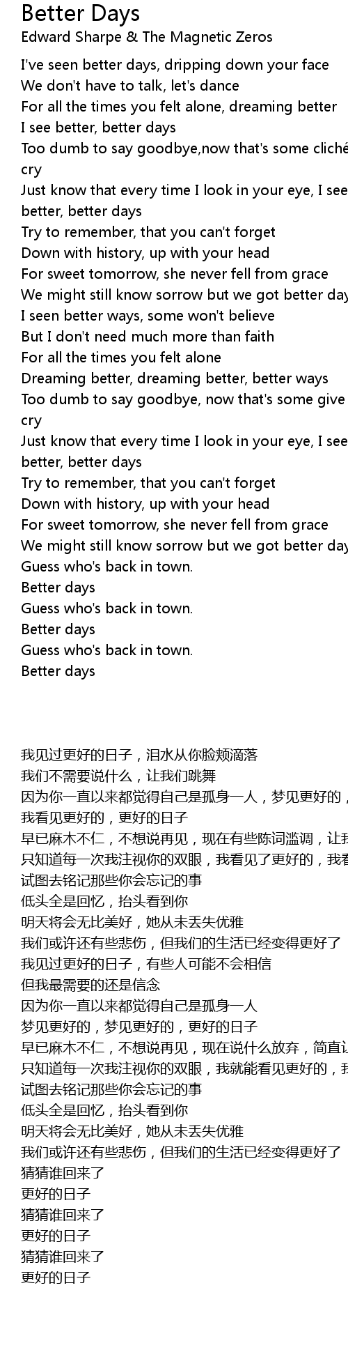 | [00:34.730] | 只知道每一次我注视你的双眼,我看见了更好的,我看见了更好的,更好的日子 |