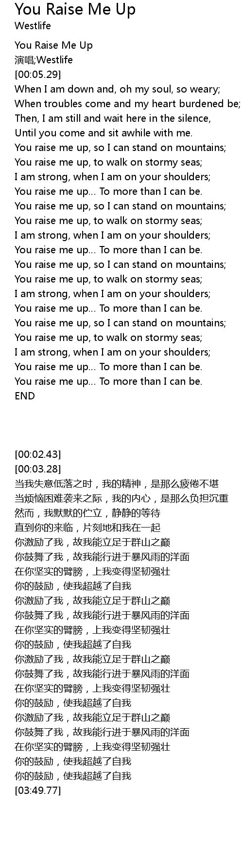 | [00:41.13] | You raise me up, so I can stand on mountains |