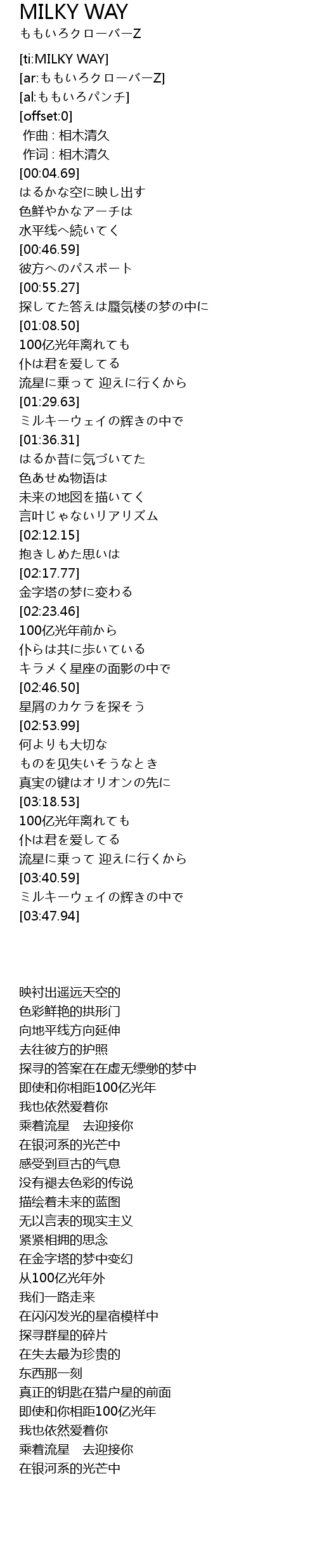 | [03:41.34] | ミルキーウェイの辉きの中で |