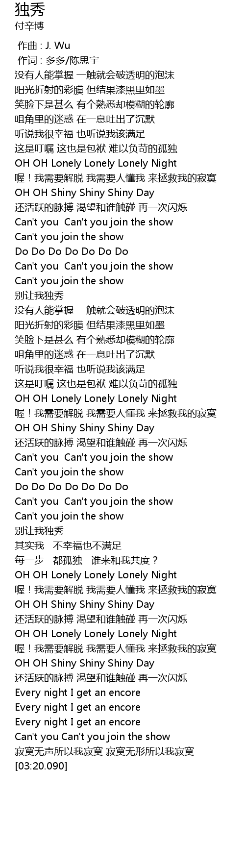 | [03:15.850] | jì mò wú shēng suǒ yǐ wǒ jì mò jì mò wú xíng suǒ yǐ wǒ jì mò |