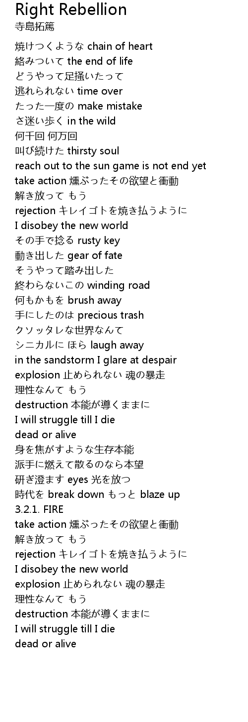 | [02:32.70] | rejection キレイゴトを焼き払うように |