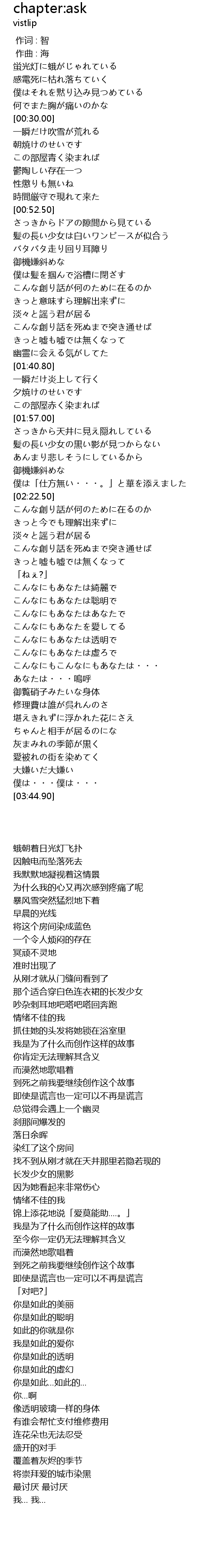| [00:16.40] | 何でまた胸が痛いのかな |