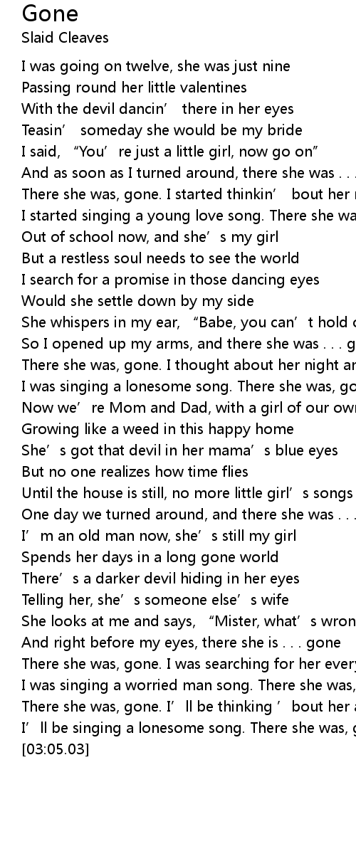 | [01:55.08] | One day we turned around, and there she was . . . gone |