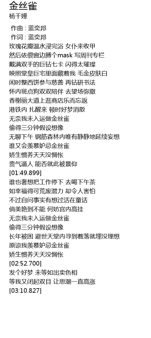 | [01:34.878] | 谁又会羡慕妒忌金丝雀 |