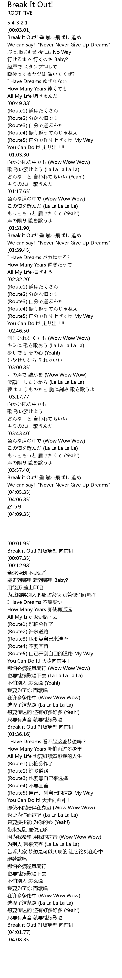 | [01:32.54] | Break it Out!! bi cu fei jin |