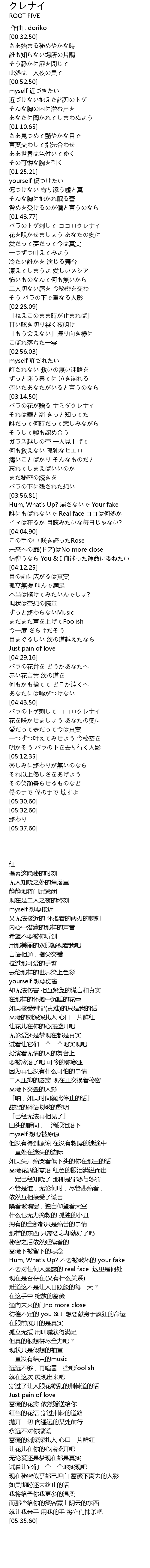 | [04:44.25] | バラのトゲ刺して ココロクレナイ |