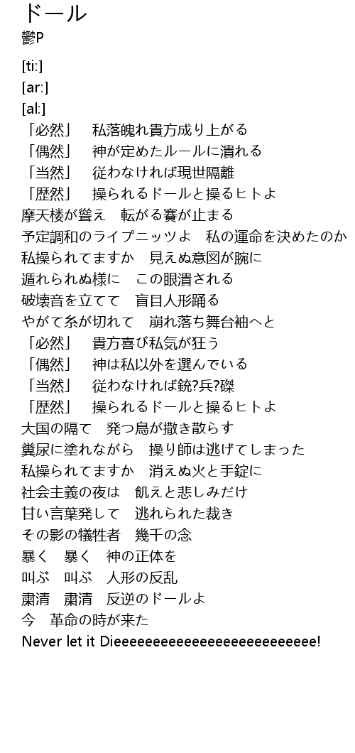 | [04:03.03] | 叫ぶ 叫ぶ 人形の反乱 |