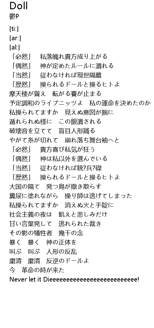 | [04:03.03] | 叫ぶ 叫ぶ 人形の反乱 |