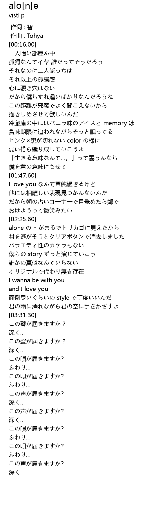 | [02:34.20] | alone の n がまるでトリカゴに見えたから |