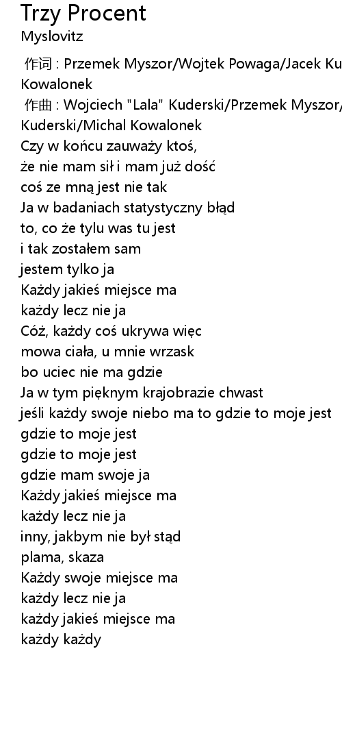 | [00:00.000] | zuò cí : Przemek Myszor Wojtek Powaga Jacek Kuderski Michal Kowalonek |