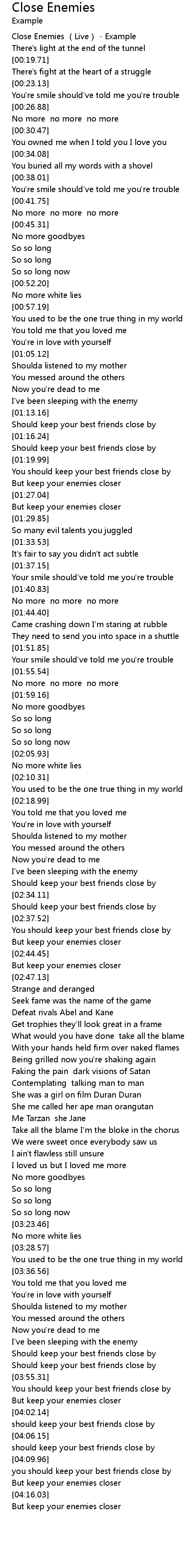 | [00:01.05] | Close Enemies (Live) - Example |