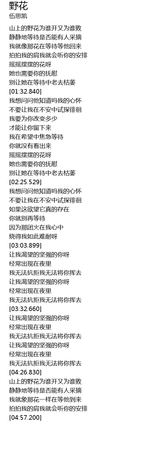 | [04:29.210] | 山上的野花为谁开又为谁败 |